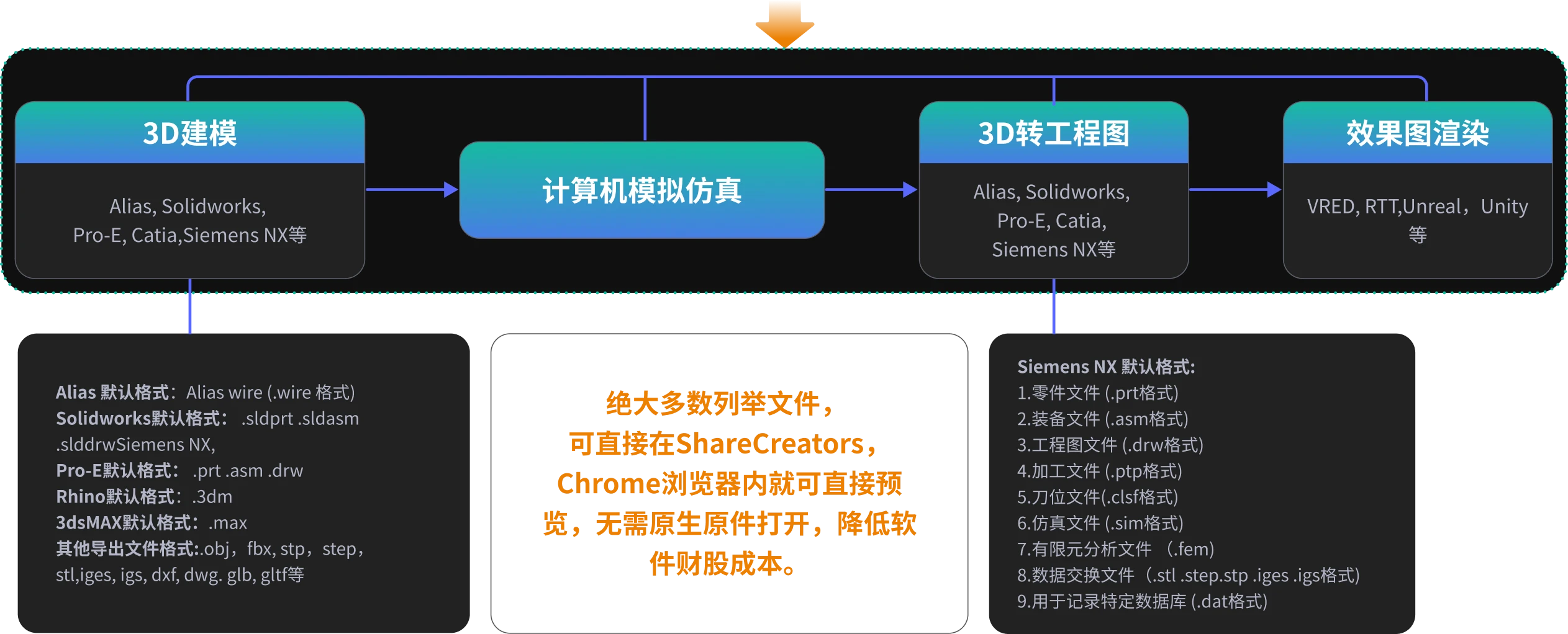 · 3D软件:Pro/E, UG NX, Solid Edge, SolidWorks (.prt .par .asm .sldprt .sldasm), Rhino, Parasolid(.3dm .x_t .x_b), Catia, JT, Adobe Alias (.CATPart、.CATProduct、.wire、.jt) 及STEP, IGES, STL, OBJ, FBX等常见格式。
